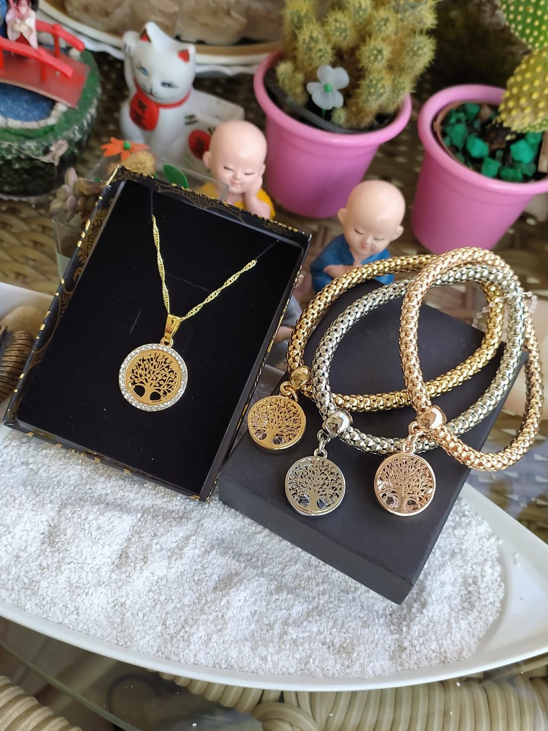 Conjunto Colar e 3 Pulseiras Árvore da Vida banhada a ouro com Conjunto Colar e 3 Pulseiras Árvore da Vida banhada a ouro com zircônia