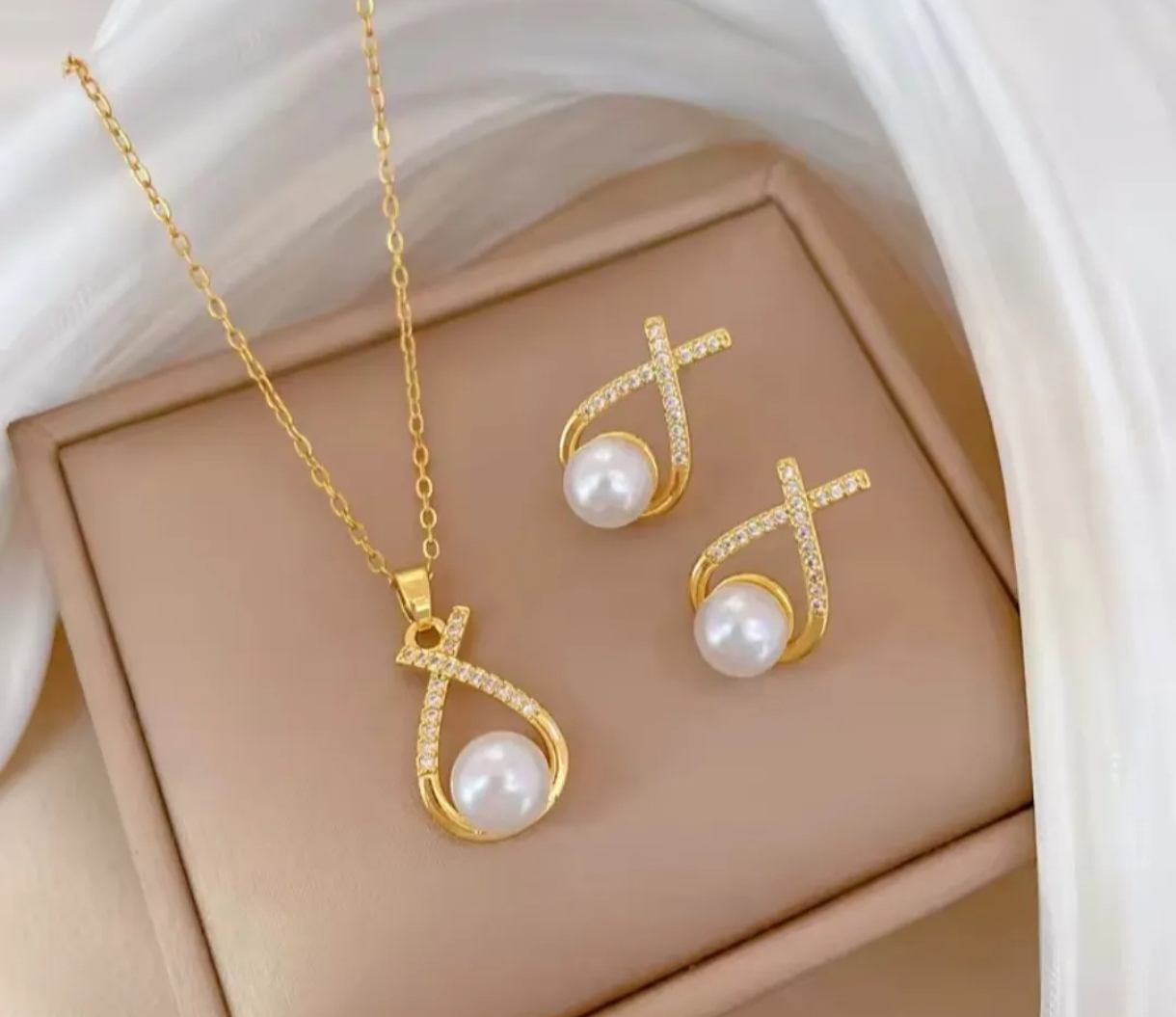 Conjunto Colar e Brincos Banhado a ouro com zirconias e pérolas laço