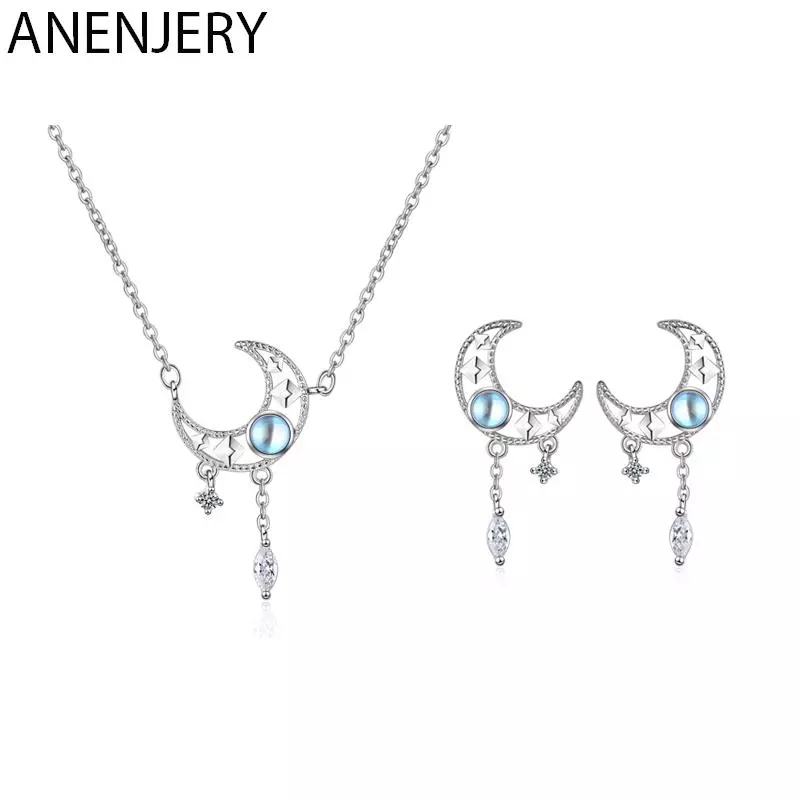 Conjunto brincos e colar de Prata 925 Lua e Estrela cristal Austríaco Azul
