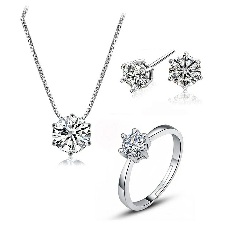 Conjunto banhado a Prata 925 solitário brincos, corrente e anel